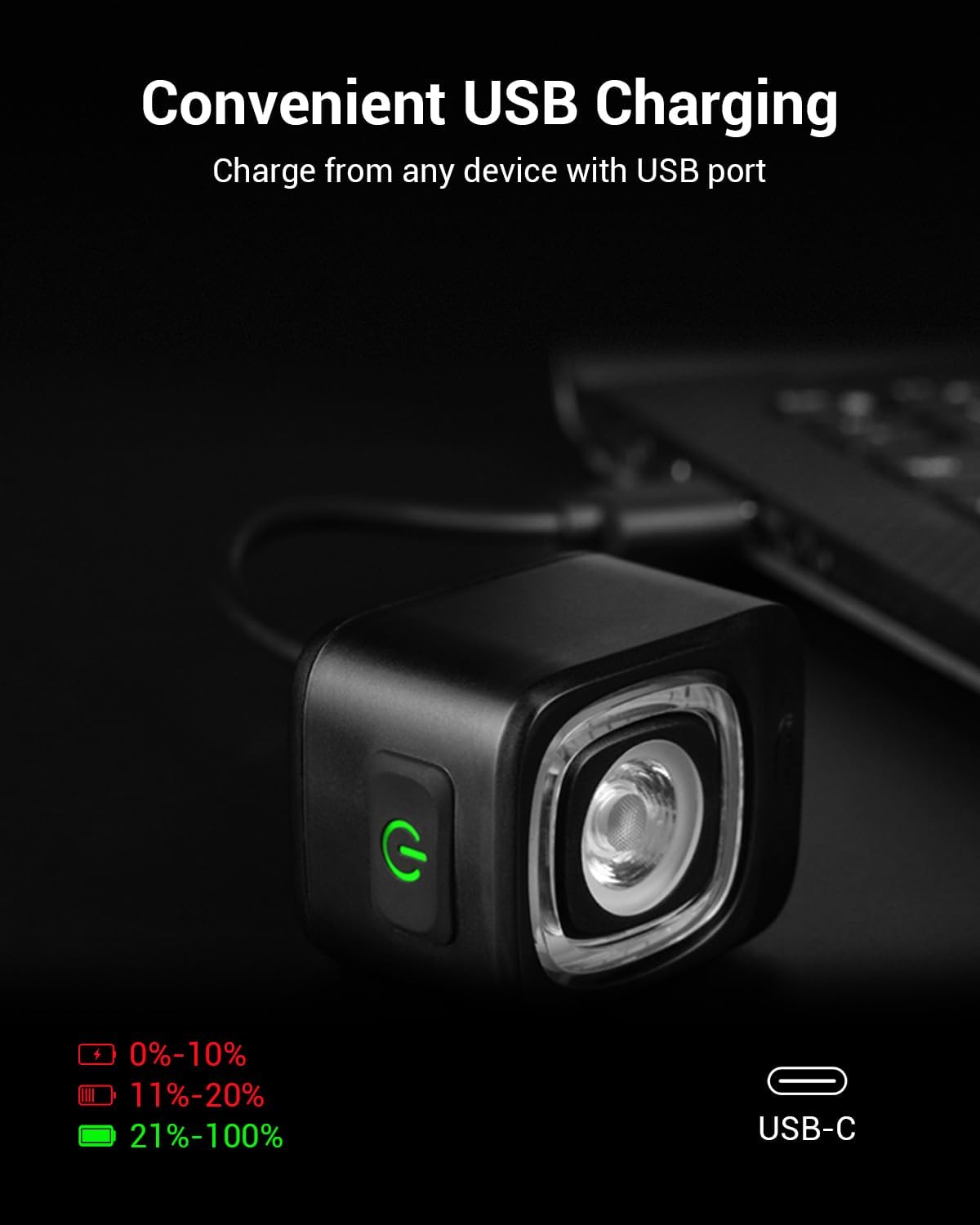 - USB C Rechargeable Bike Lights , Quick charging via Type-C, fully charging within 1.5 hours. And the light can be up to 50 hours of battery life. quick press the power button to show remaining battery capacity. Press and hold the power switch for 5 seconds to turn on/off the brake sensor function. IPX6 waterproof, suitable under all weather conditions.