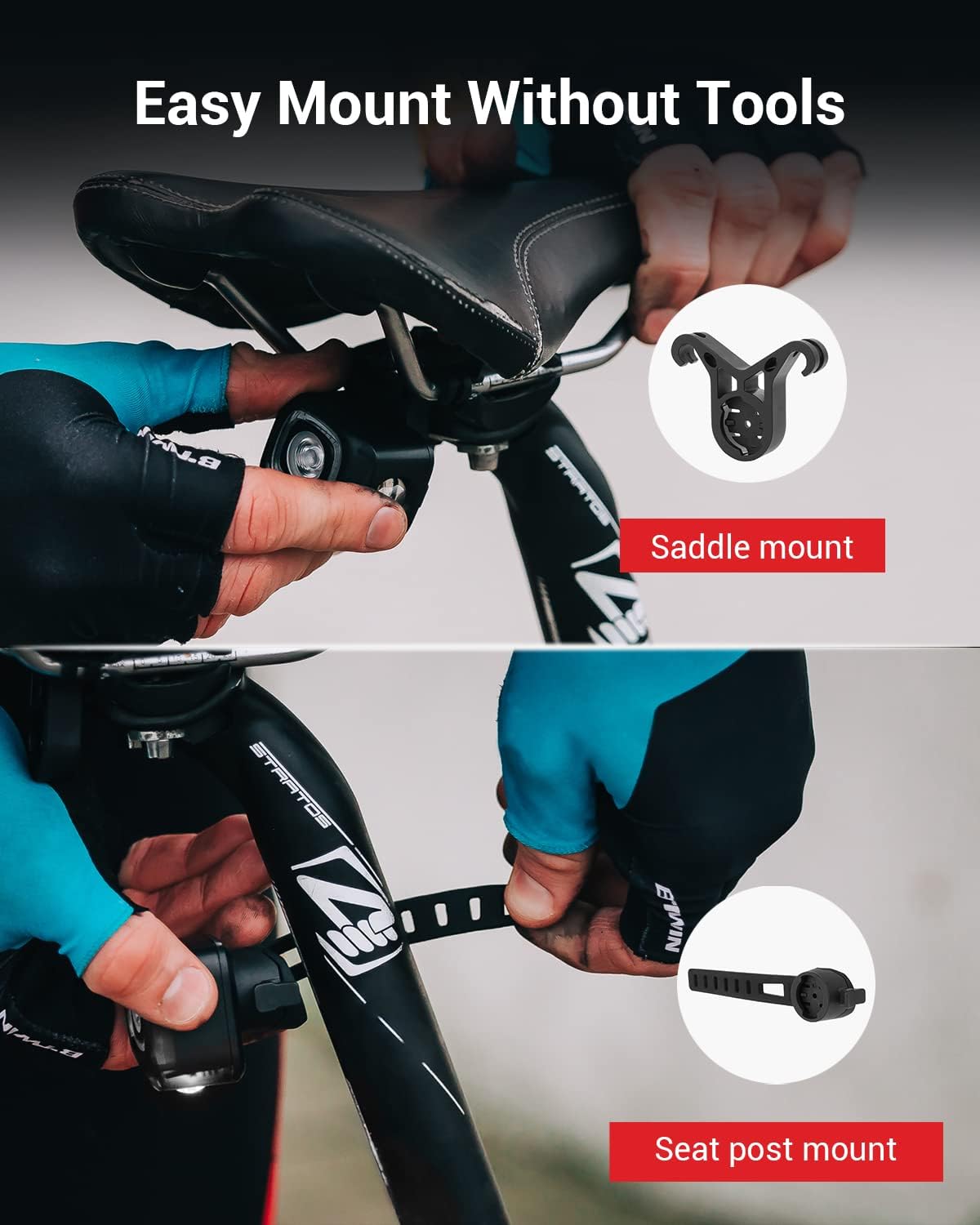 - Multiple Mounting Options - Default mounts include a length adjustable silicone strap compatible with seat-posts of various sizes, a seat rail mount that hooks onto the two metallic rails under the seat, and 2x zipties for any DIY or helmet setup.