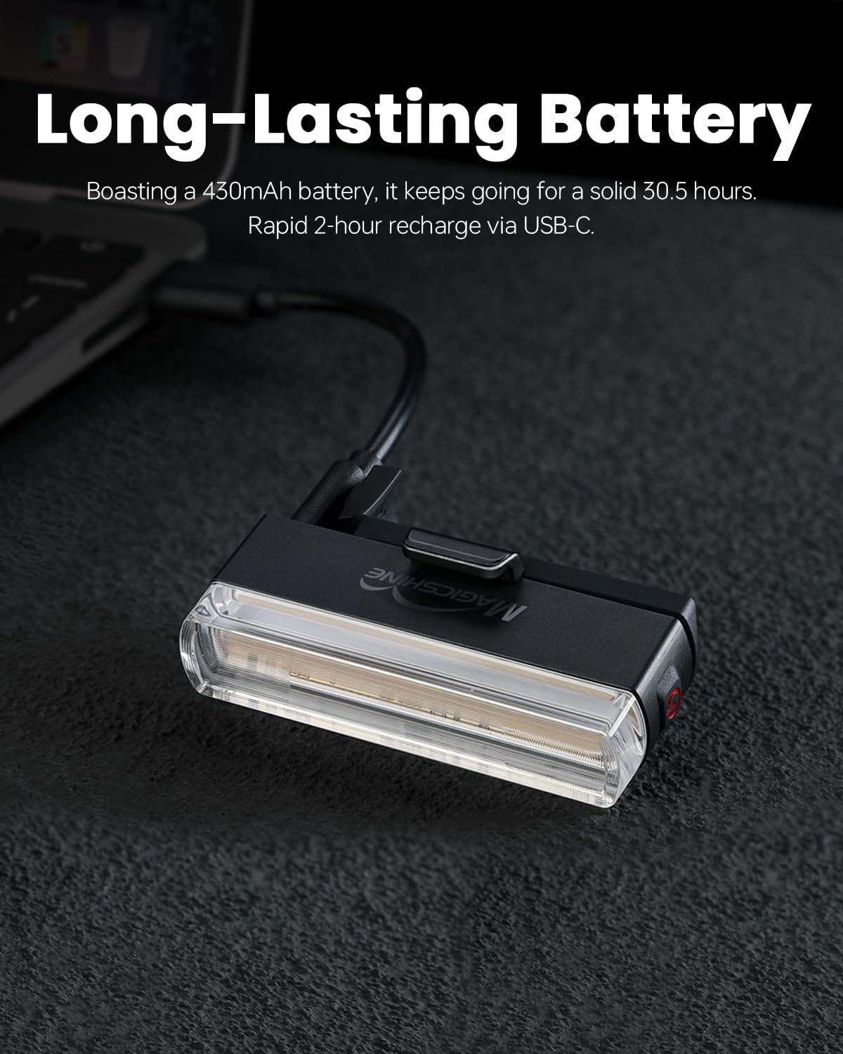 - USB-C Long-Lasting Battery: The smart bike tail light equipped with 430mAh battery, bike tail light rechargeable, keeps going for a solid 30.5 hours. A lock feature to stop accidental turns-on, saving your battery long lasting time. Memory function mode, easy-to-read battery indicator, 5 light modes and USB-C rechargeable to use friendly