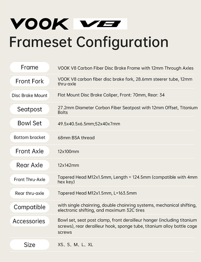 VOOK V8 Frame: An exceptionally cost-effective carbon fiber road bike frame, with a raw frame weight as light as 690g. Renowned for its extreme lightweight design and outstanding performance, the V8 is hailed as an unbeatable value carbon frame.